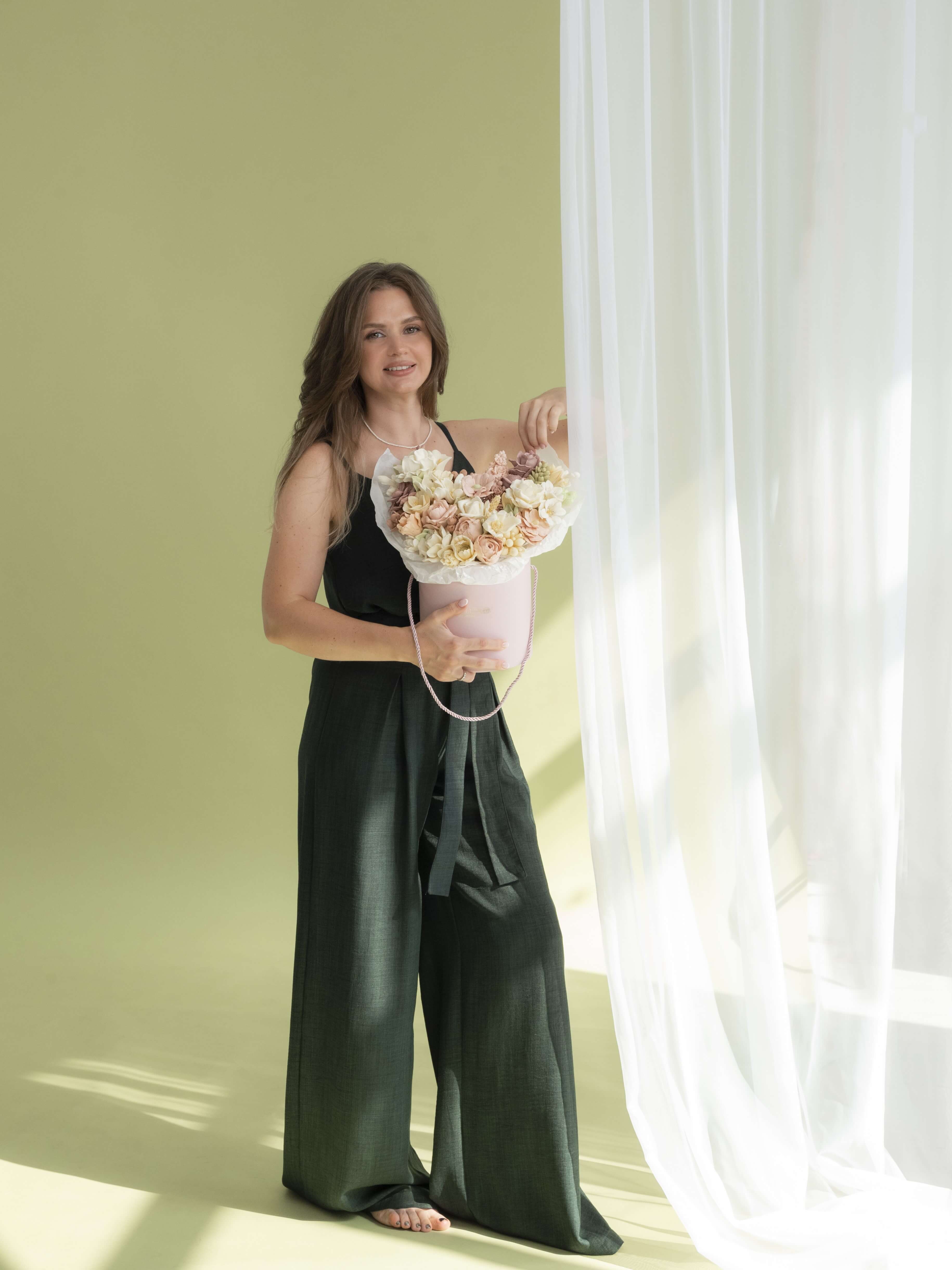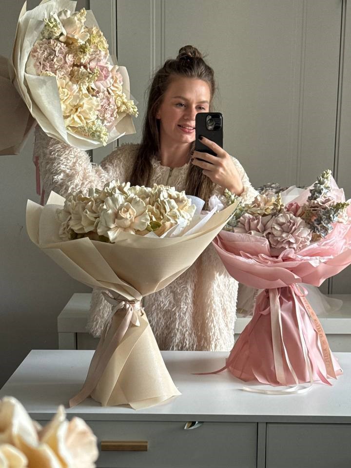 Я влюблена в творчество и самовыражаюсь создавая разнообразные композиции из зефирных цветов и птички. Помимо этого я предприниматель и мне нравится популяризировать эти продукты среди своих будущих учеников и их клиентов