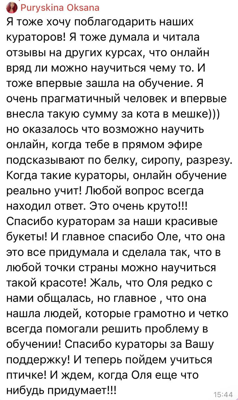 Куратор проверяет д/з, дает комментарии, уточнения и помогает вам освоить навык работы с зефирными цветами